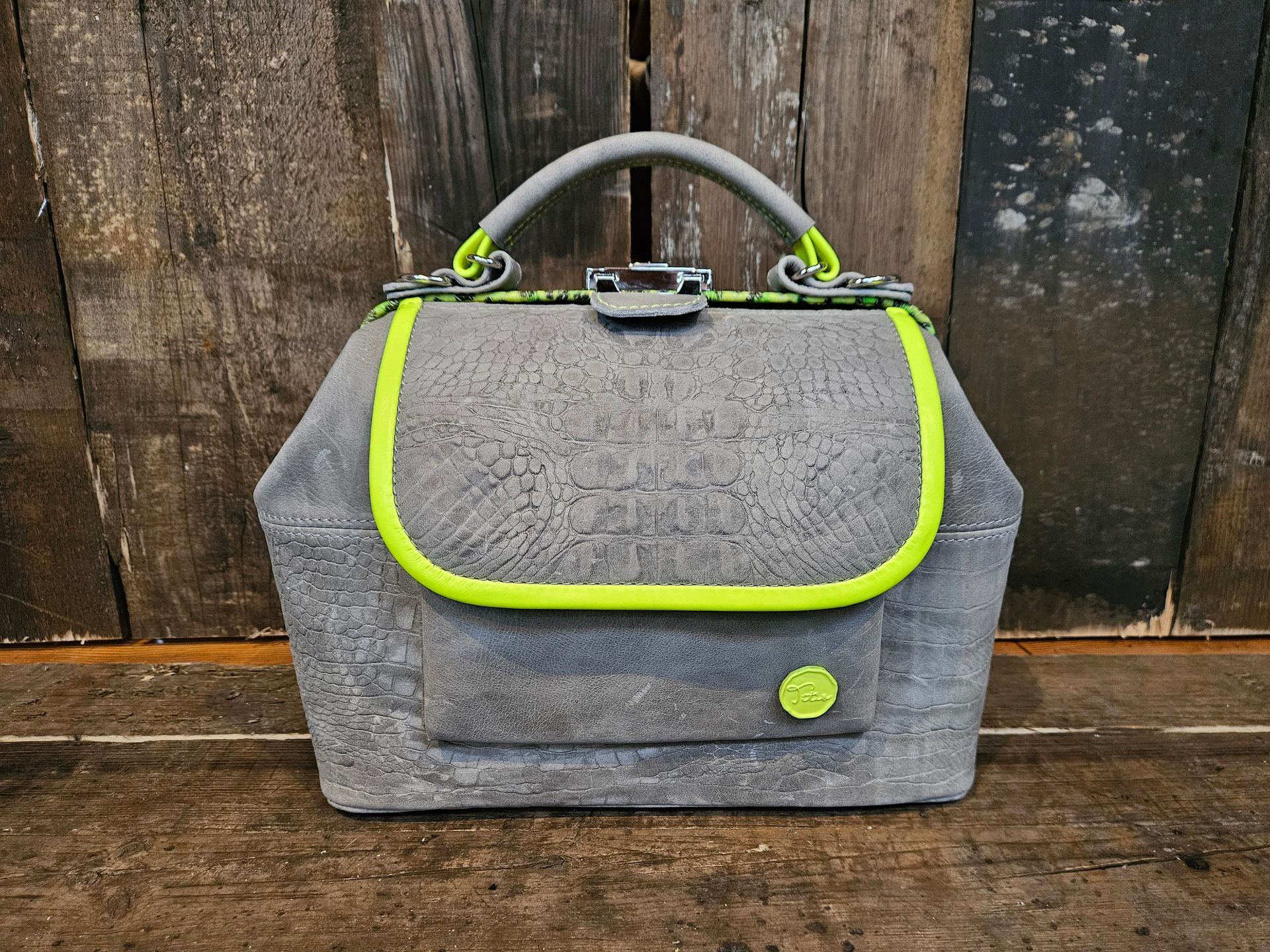 Deze dokterstas is een echte eyecatcher. Waar je al gauw bij een dokterstas denkt aan een klassieke bruine tas is dit de uitzondering op de regel. De frisse combinatie van grijs en neon-geel maakt dat hij er uit echt uit springt. Hij heeft een voorvak wat afsluitbaar is doormiddel van 2 magneten. Een gevoerde binnenkant met vakverdeling welke afsluitbaar is met een rits en nog een extra ritsvak aan de binnenkant met steekvak. De beugel van de tas is bekleed met een neon-geel panterprint leer.